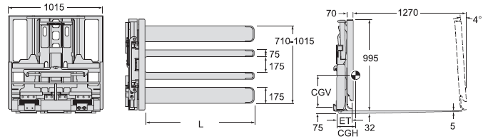 7)QFM快装型挂装式推拉器,必须同时装上标准型货叉(货叉同时承受推拉器和货叉重量),可选用的货叉厚度可达45mm,长度为1015~1170mm(推荐选用1060mm),两货叉内侧之间的距离为520~650mm,若货叉厚度大于40mm,需加装垫块,详情请洽卡斯卡特(厦门)公司。