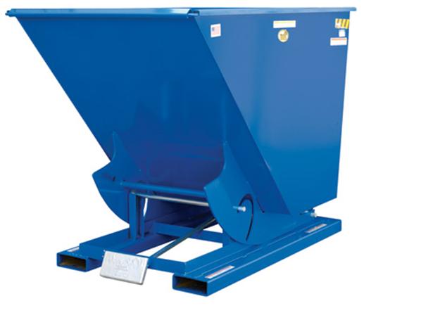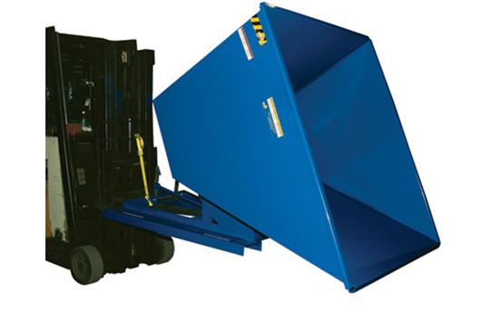 Tilt 70° and feature hopper release bumper and manual pull cables for dumping. Powder-coat finish allows extended material storage. Automatically return to locked position after dumping. Fork pockets measure 7 1/2in.W x 2 1/2in.H each. Fork pocket centers are 28in. on each.