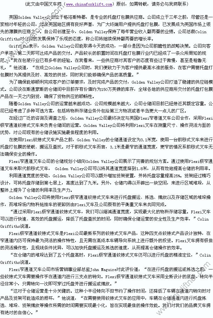 英国Flexi窄巷道叉车公司拥有超过30年的提供复杂物流方案经验以确保客户最大利用储存空间进行高效搬运并节约成本。Flexi已成为世界窄通道叉车最优秀的制造者之一,公司自己设计,生产的叉车通过代理商网络行销世界,在远东与美国同一些合作伙伴签有生产与销售协议。目前公司的产品主要有一整套系列人上位、人下位窄通道叉车、拣选车、前移车。主要品牌为Flexi,这也是公司在平衡重叉车领域的全新突破。2004年2月,公司生产的窄通道叉车被叉车协会授予设计成功奖。
