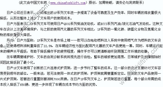 日产叉车公司是日产汽车集团之子公司,是世界上最大的叉车生产厂家之一。目前统管7家合作销售公司。在本年度内,日产计划将销售公司扩大到10家。此外还将加强公司在中国市场的售后服务和维修体制。 去年,日产公司的叉车等运输机械在全球的销售额达到700亿日元(约合5.9亿美元),但是在中国市场所占的比率却是微乎其微。鉴于中国市场的急剧扩大,该公司准备加强在中国的销售,力争在一两年内使叉车销量从目前的150台扩大到300台。