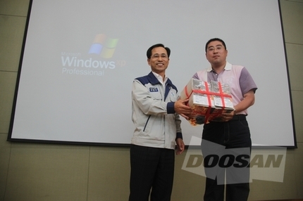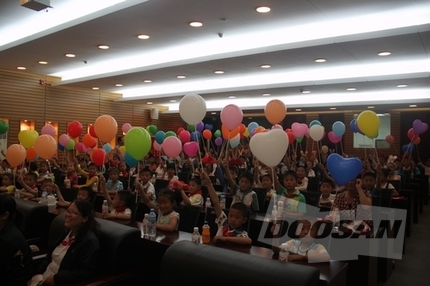 下午14:20,北官庄小学师生一行120人到达DISD,小朋友们拿到漂亮的气球和发夹,非常的开心。具英书副总经理致欢迎词,并给学校赠送了100个装载机3D拼图,作为手工课工具。观看宣传片和历程短片之后,小朋友们排成两队,浩浩荡荡的参观了工厂。大家十分好奇,四处观望,连连赞叹“厂区好大呀”、“环境真漂亮”。当看到养鱼池里的金鱼游来游去时,更是连连发出惊叹,雀跃不已。