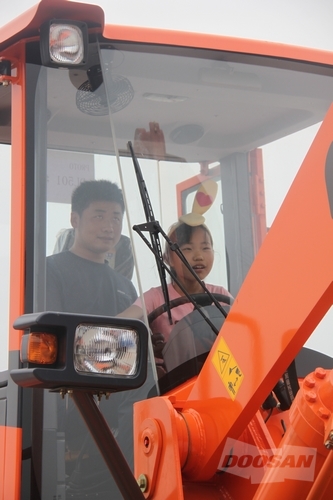 工厂参观后,安排了两台装载机供小朋友们试驾,面对庞然大物,小朋友们有点畏惧,但还是个个摩拳擦掌,跃跃欲试。最终老师选派了8名学生代表爬上了装载机,在驾驶员的陪同下操纵控制杆,做出了起降动臂和收放铲斗的动作,让孩子们兴奋不已。场地的另一边,RGT测试组已经布置好场地,驾驶员姜策的绝活——“装载机写毛笔字”即将上演。在孩子们瞪大的双眼围观下,姜策将“中国”二字用铲斗在横幅上潇洒写出,并盖上印章交给了北官庄小学的教师代表。
