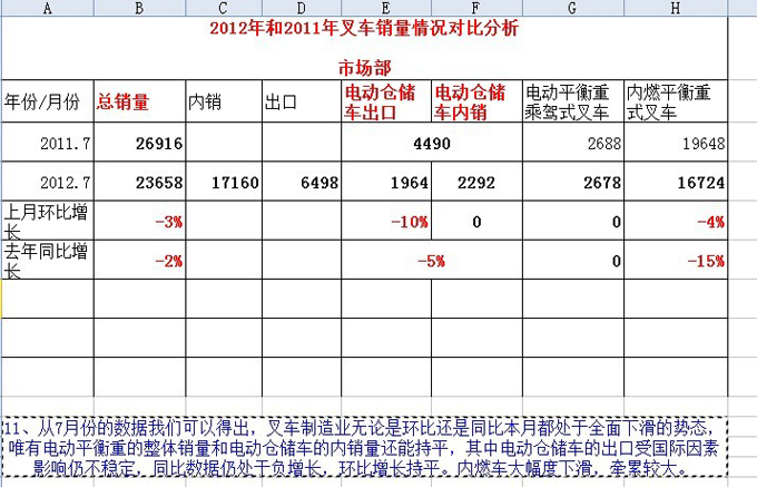 卓一电动叉车市场部根据对2012年7月份和2011年7月份叉车销量情况的数据统计分析,制作了《2012年和2011年叉车销售情况对比分析》表,从中我们可以得出,叉车制造业今年七月份无论是环比还是同比去年7月份都处于全面下滑的事态,唯有电动平衡重的整体销量和电动仓储车的内销量还能持平,其中电动仓储车的出口受国际因素影响仍不平稳,同比数据仍处于负增长,环比增长持平,内燃车大幅度下滑,牵累较大。本分析情况,仅供行业人士参考。
