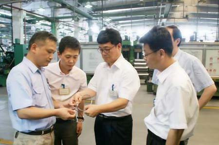 吴映雪总经理(左一)和李锺完常务(左三)在生产现场
