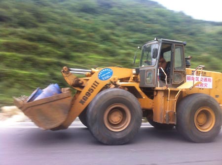 猫猫山一带,山体都是滑坡和塌方,是这次地震的重灾区。小分队停车边上的山体一直有山石滚落,部队救援人员正在进行抢险,这时小分队远远地便看到了这部厦工装载机正疾驰在路上,执行着为其他工程机械设备运送燃料的任务。而9日下午5点左右,它又接受新的任务,与另外一部厦工XG953III一起进入重灾区洛泽河一处滑坡路段抢救医院救援车。