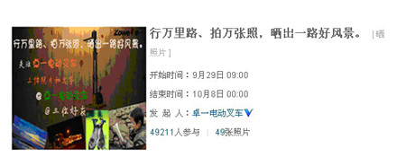 为了鼓励大家寻找幸福,收获感动,卓一叉车双节前夕在新浪微博开展了“行万里路拍万张照,晒出你的幸福”微活动,鼓励大家用手中的镜头去发现和记录生活中那些感动的人和事,哪怕是一个瞬间。