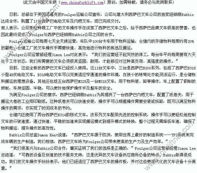 西萨巴为货物运输公司提供全新叉车