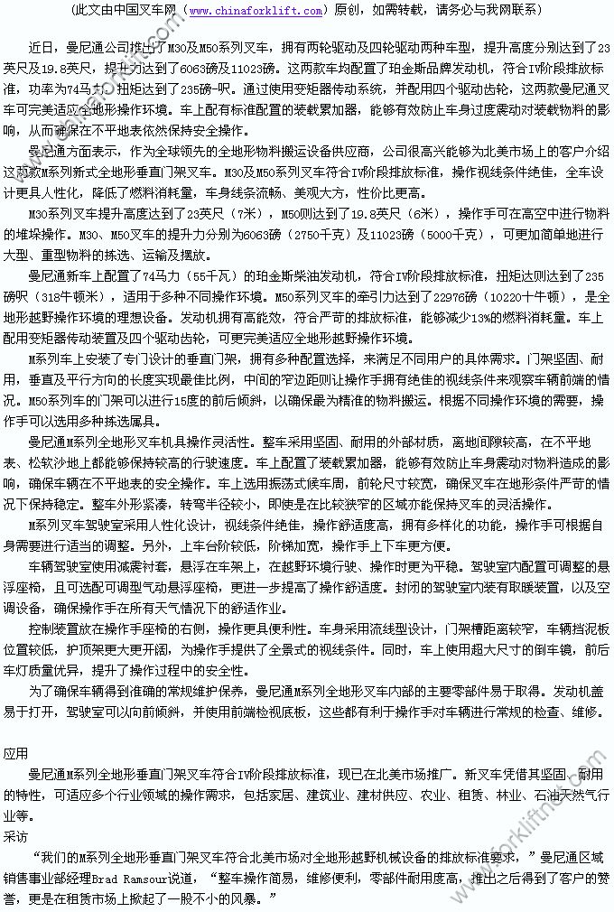 法国曼尼通(Manitou)集团成立于1956年,是法国排名第一的叉车公司,在越野叉车领域一直处于世界领先地位。是法国巴黎的上市公司,主要致力于工业叉车领域、建筑领域、农业领域三大领域的发展。曼尼通集团倡导全球化的营销理念,并一贯秉承:“让我们的客户、生产和合作者满意”的宗旨,曼尼通集团现已在全球有23个附属公司,其中17个是销售公司,5个工业性子公司,9个生产配套件基地,600个分销商,足迹遍布120个国家。曼尼通(杭州)叉车有限公司于2003年6月9日在浙江省杭州市余杭区余杭经济开发区北沙西路20号注册成立 ,是曼尼通集团在中国大陆投资的第一家独资子公司,公司注册资本540万美元,投资总额900万美元。主要生产经营1.5-3.5T内燃平衡叉车,产品销往欧洲、北美、亚洲、非洲等120个多个国家,曼尼通有着一支年轻化和专业性的团队,来自全国各地的精英汇聚一堂,朝气蓬勃,专业技术人员占员工总数的10%以上,曼尼通有着严谨和优秀的管理模式和管理理念,坚持用企业文化提升企业核心竞争力,扩大社会影响力;曼尼通有着超卓的设备,现代化的工厂规模,曼尼通以“引申我们的产品范围,扩大市场;顾客的满意度是我们至高的境界;激励我们的团队;持续有利发展”为经营理念,曼尼通人本着开拓创新的理念和敢为天下先的思想,必将拥有广阔的天空,它的发展势不可挡。