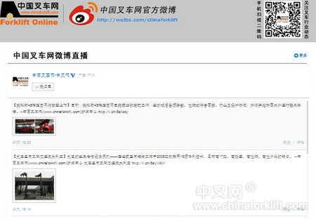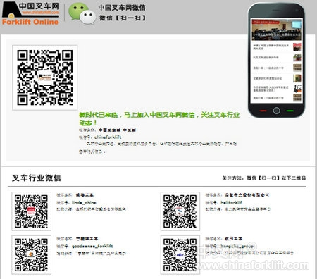 为此,中国叉车网(www.chinaforklift.com)现正收集各叉车企业的微博(官方)、微信,欢迎关注:【中国叉车网-中叉网】新浪官方微博、【中国叉车网】微信订阅号或将相关帐号信息发至中叉网客服邮箱:kf@chinaforklift.com,中叉网客服QQ:592952991。