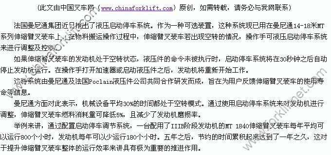 法国曼尼通(Manitou)集团成立于1956年,是法国排名第一的叉车公司,在越野叉车领域一直处于世界领先地位。是法国巴黎的上市公司,主要致力于工业叉车领域、建筑领域、农业领域三大领域的发展。曼尼通集团倡导全球化的营销理念,并一贯秉承:“让我们的客户、生产和合作者满意”的宗旨,曼尼通集团现已在全球有23个附属公司,其中17个是销售公司,5个工业性子公司,9个生产配套件基地,600个分销商,足迹遍布120个国家。