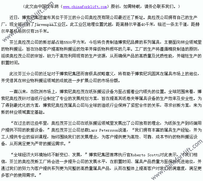 博索尼奥拉茂(无锡)叉车属具有限公司是博索尼集团在中国的又一重大投资。新工厂设在江苏省无锡市锡山经济技术开发区,占地面积 45,200 平米, 建筑面积 15,000 平米。工厂于2013年1月开始投产。公司秉承集团理念,全面采用国际先进水平的生产技术和管理模式,致力为客户提供全方位、系列化和一流的设备制造、技术支持和售后服务。