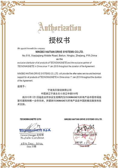 2015年1月1日起,意大利泰磁有限公司(Tecnomagnete S.P.A)正式授权宁波海天驱动有限公司为其在中国市场的唯一合作伙伴,并由海天驱动提供其所有产品在中国的售后服务和技术支持。