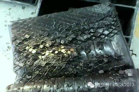 (2)塑壳电池用铁锯沿槽盖热封处将蓄电池锯开,在观察壁焊连接处有无虚焊假焊及断裂情况以及极柱与端柱连接情况后,用铁锯将壁焊处锯开,将每个极群组抽出,放入铁盘内。