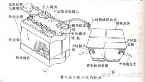 (1)蓄电池连接条(壁焊处)及端柱与极柱联接处,汇流排与极板连接处出现虚焊假焊,致使起动性能不佳或无法起动。