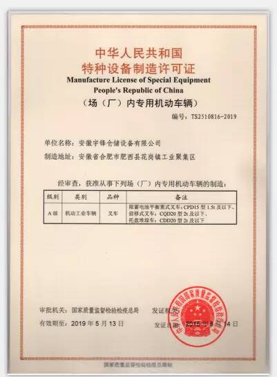 热烈祝贺宇锋叉车取得特种设备制造许可证