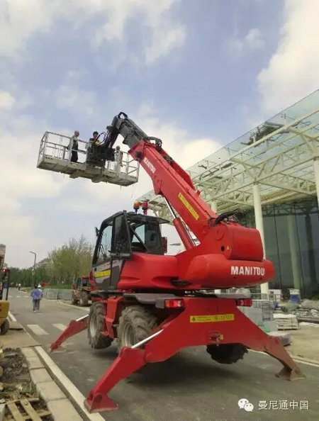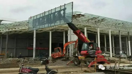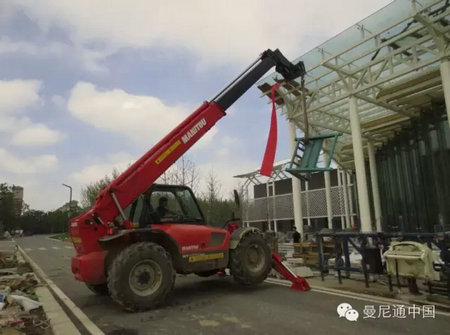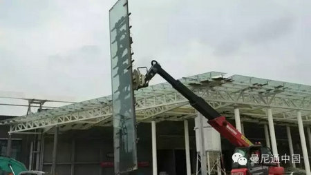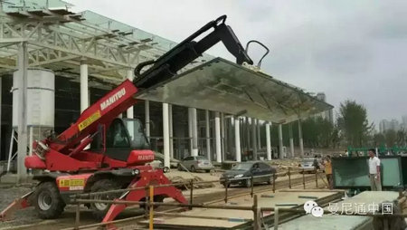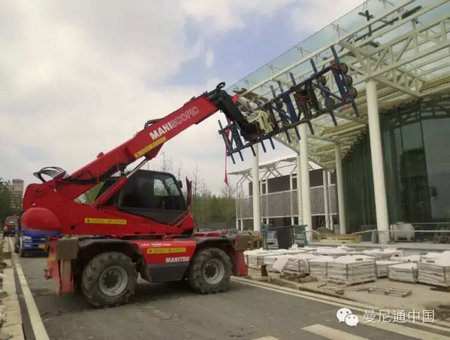 传统的玻璃幕墙安装主要借助人力,施工条件危险,玻璃破损率高。而如遇到超大超重型玻璃幕墙,借用吊车安装也往往受到狭小或室内等复杂场地条件的限制不能正常施工。作为国际领先的玻璃幕墙安装工艺,曼尼通旋转型越野伸缩臂叉装车+玻璃吸盘属具方案无疑是最佳选择。曼尼通MRT-X1840,举升高度18米,额定载荷4吨,可以带玻璃行驶。属具带旋转器,可以根据安装需要旋转玻璃,同时车体大臂臂端本身具有上仰、下翻功能,也为进入建筑物提供方便。
