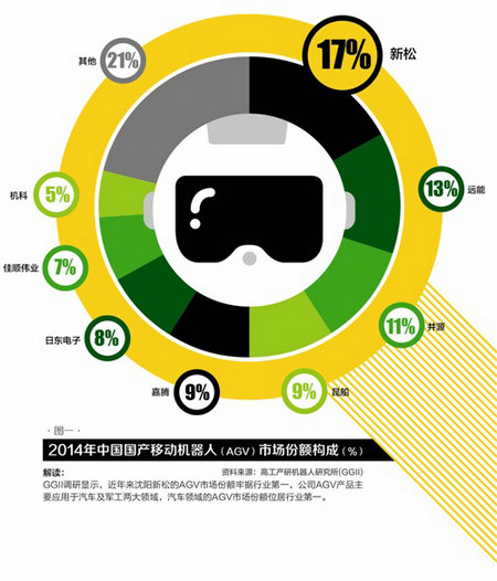可以说,新松AGV机器人像一柄尖刀,刺破了国际机器人巨头企业的垄断大幕。数据显示,2014年,国内机器人市场上,唯有AGV机器人的国产化达到了78.13%,而广泛应用的平面关节型机器人和多关节型机器人的国产品牌占有率仅为10%左右。
