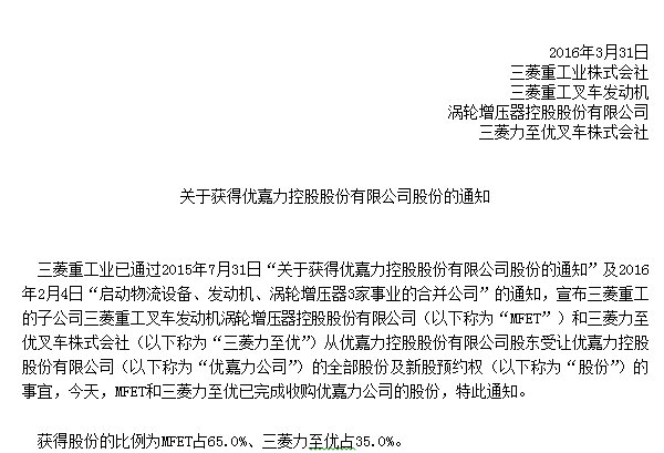 三菱重工业已通过2015年7月31日“关于获得优嘉力控股股份有限公司股份的通知”及2016年2月4日“启动物流设备、发动机、涡轮增压器3家事业的合并公司”的通知,宣布三菱重工的子公司三菱重工叉车发动机涡轮增压器控股股份有限公司(以下称为“MFET”)和三菱力至优叉车株式会社(以下称为“三菱力至优”)从优嘉力控股股份有限公司股东受让优嘉力控股股份有限公司(以下称为“优嘉力公司”)的全部股份及新股预约权(以下称为“股份”)的事宜,今天,MFET和三菱力至优已完成收购优嘉力公司的股份,特此通知。