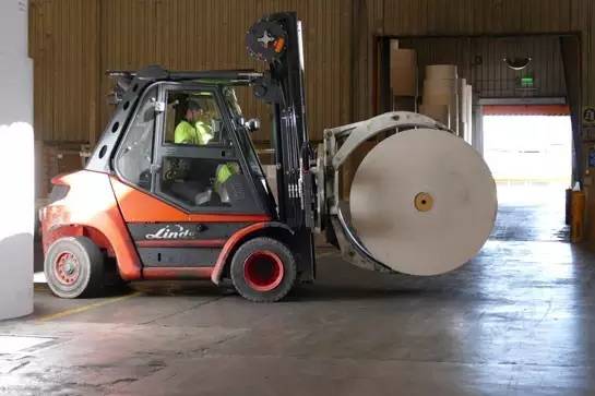 在工厂外面有一个回收厂作为存储场地,它拆散了饮料箱把他们分类成为塑料,铝和纸。工厂是不需要铝和塑料的,所以都可以卖出去。巴塞罗那纸板公司最重要的原料是纸,约占其总材料的75%。为了满足回收利用的特殊需求,一年里有358天,都要用装配了纸卷夹属具的柴油叉车夜以继日地在工厂做装货作业。一旦材料被分类分开,其中的纤维纸浆就会被倒入大缸,然后转换成纸板在一台机器截取45米的长度,在生产线上变成重达25吨,4米宽,20000米长的纸卷。这些都是巨大的产品,根据客户订单,使用其他机器切成较小的纸卷。即使是这样,这些纸卷仍然相当大,直径至少1米。这要求叉车必须有强大的搬运能力以及一个能力卓越的属具供应。