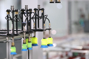 在分拣机器人旁边,有一个关键的黑匣子,里面两个摄像头背后,具备了深度学习的神经网络,通过对大量商品外表面进行观测,不仅可以确认周转箱里放的是否是订单所需,同时还要指导Delta并联机器人,究竟在哪个位置抓取怎样的一个商品。右图是一个换头的操作,对于不同的件型、商品尺寸和重量,分拣机器人需要换不同的吸盘后才继续工作。