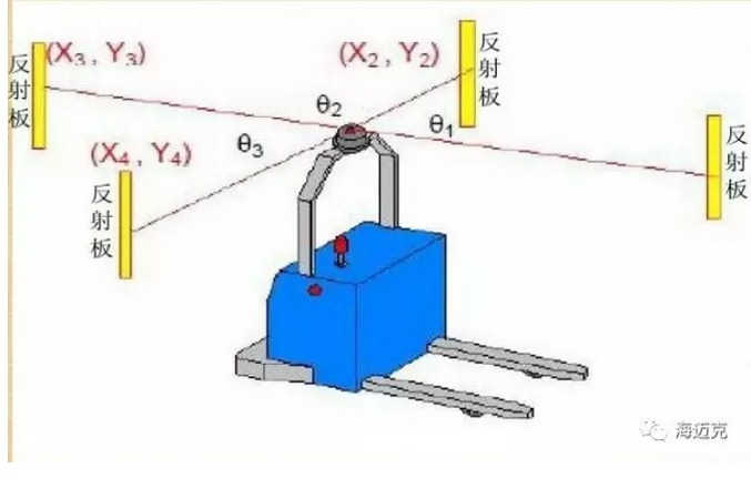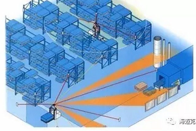 海迈克AGV采用的是激光引导是引导方式,是除GPS外唯一不需要地面处理的引导方式。激光导引在AGV 行驶路径的周围安装位置安装若干激光反射板,先由人工驾驶AGV 通过激光扫描器发射激光束,同时采集由反射板反射的激光束,通过三角几何运算确定工作现场当前各个反射板的位置。然后在后台电脑中运用AI算法规划路径来实现AGV 的导引。