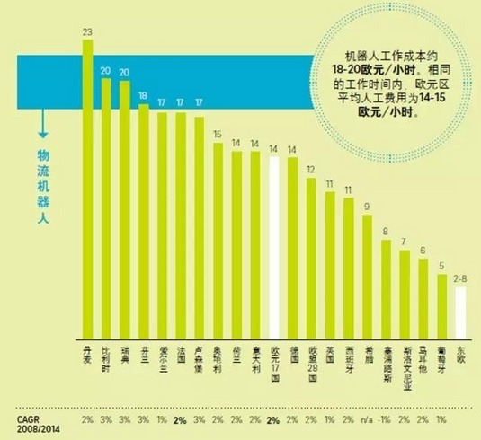 在连续使用的情况下,机器人的生产效率是人工的4-6倍,有望节约20%-40%的装卸搬运成本,并提高营业额;机器人正常工作平均花费18-20欧元/小时,低于欧洲劳动力成本昂贵的国家,而劳动力成本将不断攀升,机器人的平均花费将有望在2020年降至10欧元/小时以内。