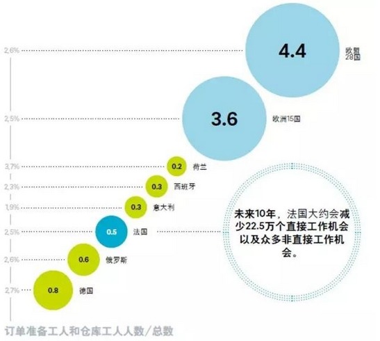 虽然物流业机器人化仍处于起步阶段,但是其巨大潜力使物流业重新思考几十年来的固有工作组织模式。若无任何过渡性准备,未来十年,将机器人应用于物流业将直接导致成千上万的非技术性工作岗位消失,欧元区将消失150万个工作岗位,其中最受影响的领域将是配送、制造业和外包的物流服务公司。
