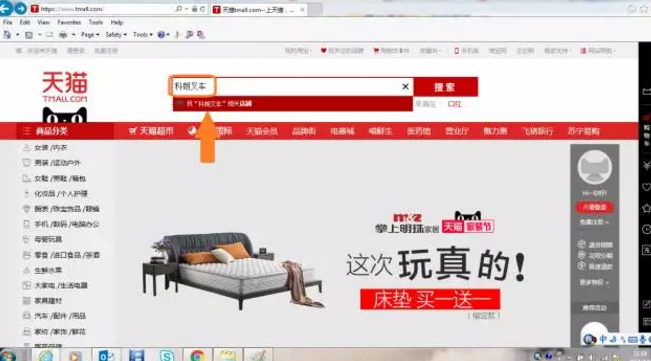 方法二:进入天猫首页,搜索“科朗叉车”,点击下拉框中“找”科朗叉车“相关店铺”