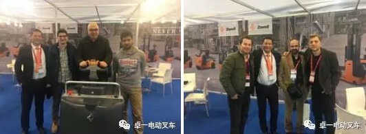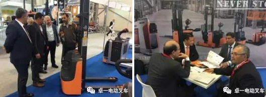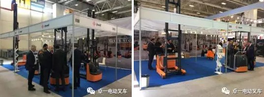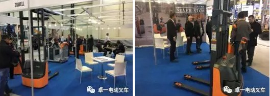 卓一叉车本次选择了特殊展位,正对面是STILL1000平方的超大展位,林林总总不下50台展车,新车、二手车、3D培训体验车应有尽有,展品、人员堪称豪华阵容,卓一展位背后是林德500平方的展位,侧面是永恒力400平方的展台,几天展会我们共接待了100多位客户来访,其中行业经销商有20多家,虽然身处欧洲列强的包围,但卓一不惧与欧洲品牌正面交手,第一次走向国际舞台的轻量搬运车XEA表现堪称优秀,靓丽的工业设计,精致的做工,吸引了土耳其一个客户一次性订购68台,这可是比中国同行同一款车单台高出了几百美金,让我们在国外展会第一次体验了品质的溢价。