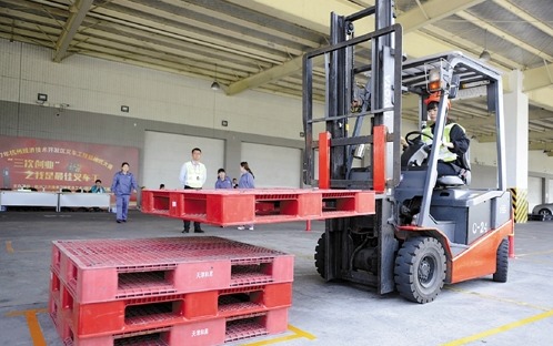 记者在现场看到,叉车比武共有两个项目。一是叉车曲线运水作业,这个项目考验的是平稳性和安全性,叉车工需要在规定的100秒时间内,将A点存放水桶的1.5米塑料栈板叉起,前进行驶,经过右转、左转、左转、右转达到B点,再倒车作业,经过右转、左转、左转、右转回到A点;二是绕曲线栈板叠放作业,这个项目考验的是技能性和精准性,叉车工在规定的180秒时间内,将库内A区的4块栈板逐块叉到B区整理后放回A区。