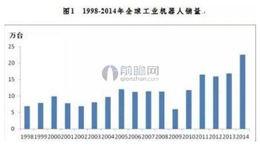 据前瞻产业研究院《中国服务机器人行业发展前景与投资战略规划分析报告》的分析,近年来全球机器人销量稳步上升,仅工业机器人的销量就在2014年达到22.5万台。未来行业规模仍旧会稳步扩张。