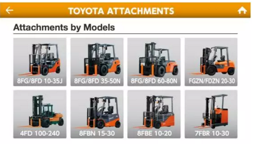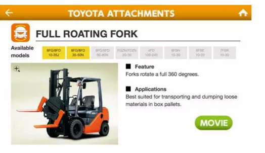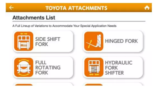 如何才能找到与您货物和工况相匹配的属具呢?当然您可以拿起电话咨询您所在地的丰田经销商销售专员,除此之外您还可以通过智能手机获得答案。