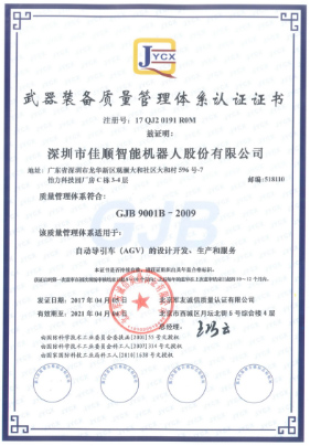 在2016年5月中国新三板最有价值企业评选中,佳顺智能脱颖而出,成为深圳新三板最具有价值企业,2017年3月,佳顺智能(股票代码:834863)凭借其优秀的AGV产品,以创新为魂的企业理念,一举夺得深圳中小微创新百强企业称号,同年4月,顺利通过专家组的评审,成功获得“武器装备质量管理体系认证”证书,佳顺智能从此有了进入军工市场的“通行证”。