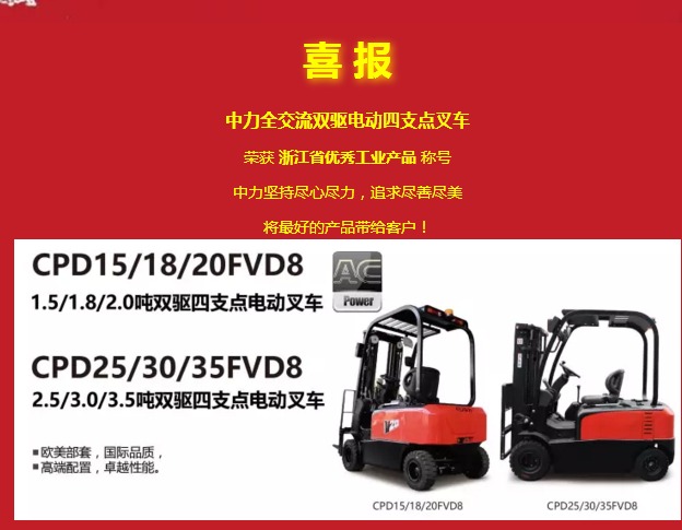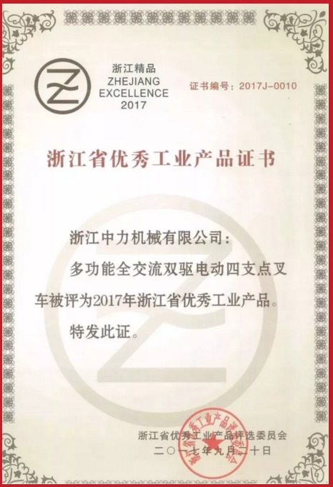 【尽心尽力,尽善尽美】中力全交流双驱电动四支点叉车被评为【浙江省优秀工业产品】