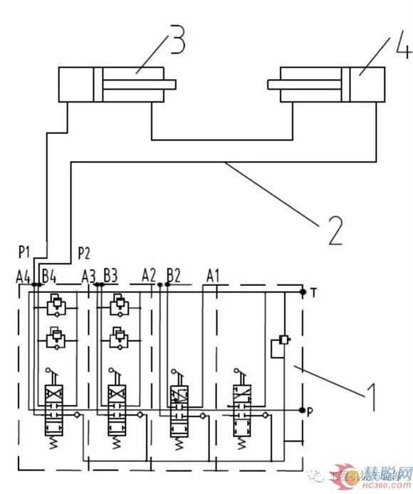 为解决现有4片换向阀不能满足挂装复杂属具问题,经研究我们决定对门架液压回路进行改进,即在现有换向阀组1的第4片换向阀管路上增加1个二位六通电磁阀3,以增加1个属具缸5动作需求。改进后门架液压回路如图2所示。图2中的管路(2、4)用于连接二位六通电磁阀3和属具缸5。