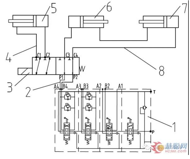 图2改进后门架液压回路 1.换向阀组2、4、8.管路 3.二位六通电磁阀5.属具缸6、7.侧移缸