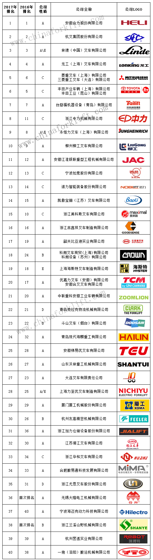 2017年中国工业车辆前40名约占全国总销售量的96%以上。