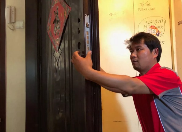 ▲李艳军正帮用户把旧的机械锁拆下,换上智能锁