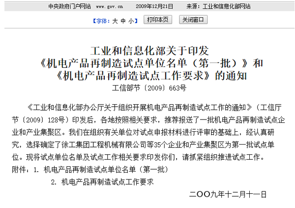 国家工信部于2009年发布了首批35家再制造试点企业名录,2011年1月28日,工信部批复10家单位再制造试点实施方案,其中工程机械行业有徐工集团工程机械有限公司、广西柳工机械有限公司、三一集团有限公司共三家公司。