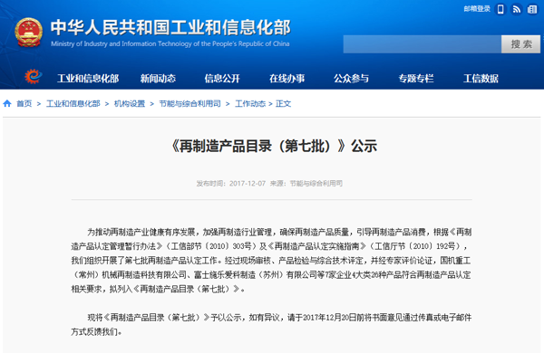 同样从工信部的网站了解到,从2011年至2017年,工信部共公布了七批再制造产品目录,从2011年公布第一批再制造产品目录中看到工程机械行业的再制造产品目录均为柳工产品。