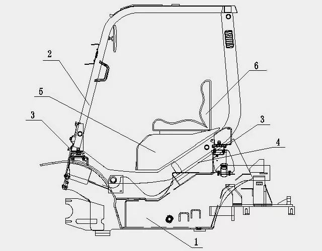 叉车车架前端安装有前围板,用来安装叉车名牌、仪表盘、转向管柱等件,并起到保护叉车驾驶员安全的作用。车架上还装有叉车发动机机罩,座椅和护顶架(叉车驾驶员室)。根据叉车使用安全标准,为了保护叉车驾驶员的安全,护顶架需经过静压试验和冲击试验。平衡重叉车上还配有插销,可以实现叉车牵引的功能。