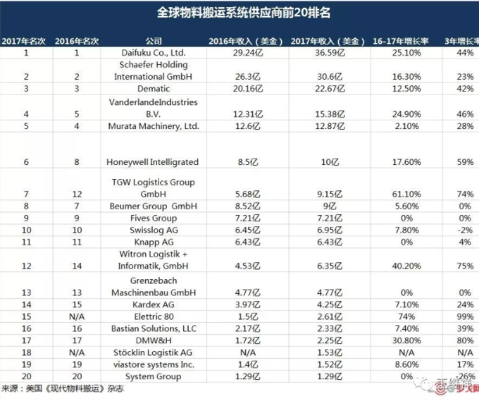 于是,一大批物流系统集成商逐渐涌现,当然按照《现代物料搬运》杂志的标准,进入榜单的企业必须在北美设有公司,并能及时提交相关营收数据。