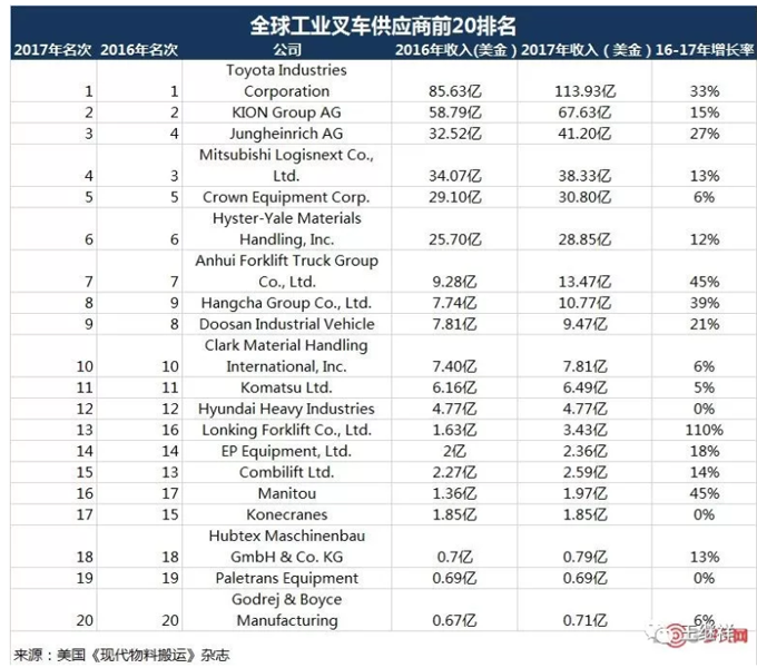 二、全球工业叉车供应商前20排名