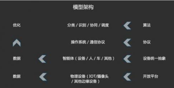 最底层是物理设备,包括传感器、摄像头和边缘设备等,主要用来处理实体货物;往上需要抽象成一层智能体,对异构的物理实体进行转换,使之可以往上继续做同构操作,智能体既包括设备也包括人;再往上一层是操作系统,包括物理设备的操作系统和通信协议,便于不同智能体之间信息的互传;最上层涉及真正的智能化操作,包括分类、识别、协同和调度算法等。