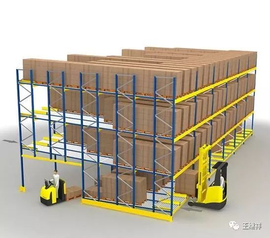 重力式货架:由托盘式货架演变而成,采用辊子式轨道或底轮式托盘,轨道呈一定坡度(3°左右),利用货物的自重,实现货物的先进先出,一边进另一边出,适用于大批量、同类货物的先进先出存储作业,空间利用率很高,尤其适用于有一定质保期、不宜长期积压的货物。