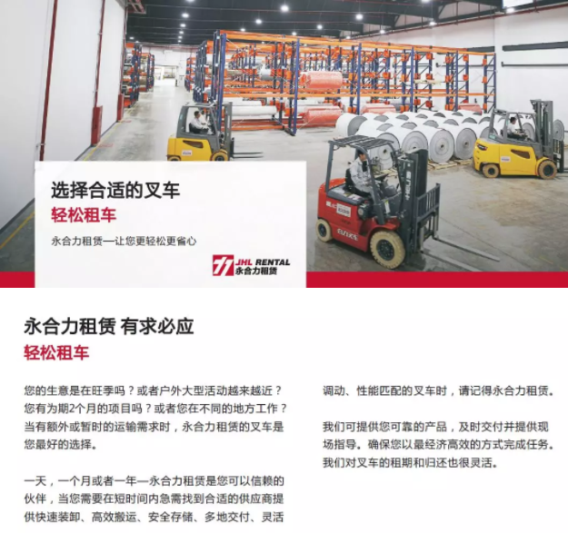 618又要来了!电商旺季用车高峰!仓库周转越来越繁忙!采购压力越来越大!如何找到大量短租叉车?六一儿童节户外活动近在眼前,场地搭建只要用车二天!怎么快速找到合适的车源?当您有额外或者暂时的运输需求时,永合力租赁的叉车就是您最好的选择!无论一天、一个月或者一年---永合力租赁是您值得信赖的合作伙伴。当您急需短时间内找到供应商提供快速装卸、高效运搬、安全存储、多地交付、灵活调动、性能匹配的叉车时,请记得永合力租赁。