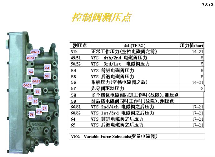 然后外接压力表至变速箱控制阀,根据控制阀测压点分布图(如下),在机车运行时依次测量变速箱前进挡(64)、后退档(65)、1/3档(60/62)、2/4档(66/61)电磁阀后压力,压力值均保持在22bar。而且该压力值与变速箱壳体上测得的各档毂压力值相同,说明变速箱档毂运行状况良好,不存在泄压打滑的问题。多个档毂同时工作的故障检查点(58/59)也没有检测到压力。根据以上检测结果表明变速箱阀组、内部档毂运行正常。