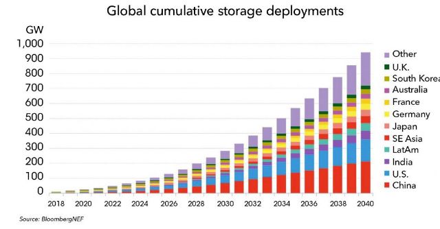 图1. 2018年至2040年全球累计部署的锂离子电池储能系统装机容量(单位:GW)