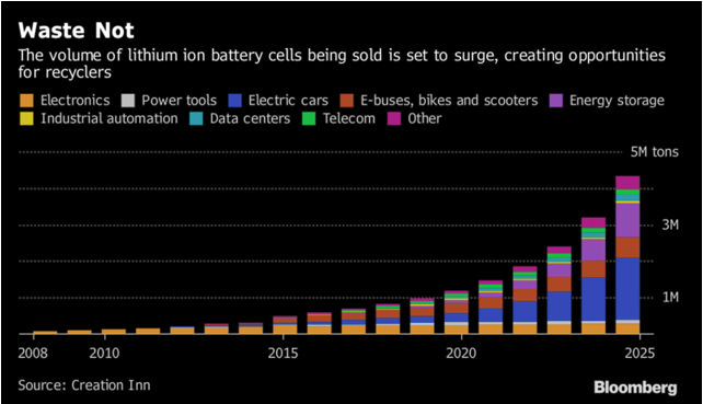 调研机构的预测描绘了一个令人鼓舞的前景:随着全球可再生能源和清洁能源采用量的迅速增长,基于锂离子电池的储能应用也越来越广泛。在电动汽车以及电网规模的储能应用的推动下,锂离子电池的销售量将会激增(如图1所示)。图2中的图表描述了预计到2025年锂离子电池的销售量(以吨为单位)。锂离子电池数量的大量增长促使行业厂商致力于寻求一种具有商业规模并且经济可行的回收解决方案,用于大规模处理和回收废弃的锂离子电池,以下将探讨锂离子电池回收行业当前面临的一些挑战,以及克服障碍的方法和机会。