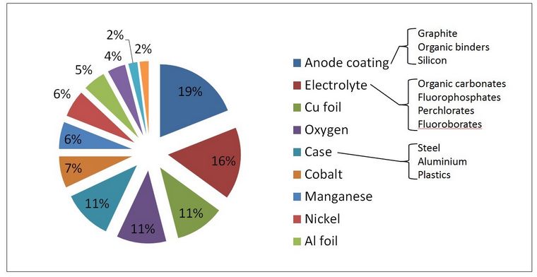 从电池回收工艺的角度来看,由于锂离子电池原料的高度异质性,与传统的金属资源回收相比,锂离子电池的回收面临独特的挑战。目前,市场上的锂离子电池至少存在14种不同类型的阴极材料,当考虑特定成分时,每种阴极材料都有所不同。对于传统的金属资源,采用主要回收措施可能回收1到4种金属元素(例如铜、金、银和铂等)。但是,锂离子电池可能需要考虑回收利用20多种元素,如图3中的元素组成。另外,这些金属元素通常与无机材料、有机材料和塑料混杂在一起,这进一步使锂离子电池的回收过程复杂化。为了能够分离出有价值的成分,通常需要具有许多单独单元操作的复杂工艺流程图。在这种情况下,电池回收工艺流程进行的物理测试工作是非常关键的,并需要通过技术和经济来驱动。